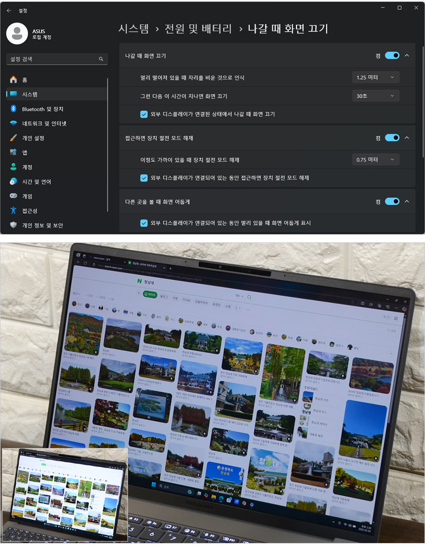 이 제품은 인체감지 기능도 지원한다. 사용자가 다른곳을 볼때 자동으로 화면이 어두워 지며 자리를 비우면 화면이 자동으로 꺼지도록 설정할 수 있어 보안성과 편의성을 한층 높일 수 있다. @ 이 기능은 얼굴인식과 함께 사용하는 것을 적극 권장한다. 외부에서 자리를 비우면 자동으로 화면이 꺼지며 노트북이 잠금 상태가 되며 사용자가 자리에 앉으면 얼굴을 인식해 자동으로 켜지며 로그인 된다. 인체감지 설정은 설정->개인정보 및 보안->존재감지->존재감지 설정에서 셋팅할 수 있다.