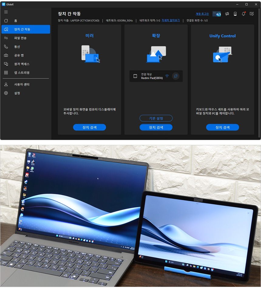GlideX 앱을 지원해 화면의 복제나 확장, 유니파이 컨트롤이 가능하다. 상단의 사진은 확장 기능을 실행한 모습으로 태블릿 PC를 확장 모니터로 사용할 수 있었다. (참고로 미러를 선택하면 스마트폰 화면이 노트북에 표시된다.)