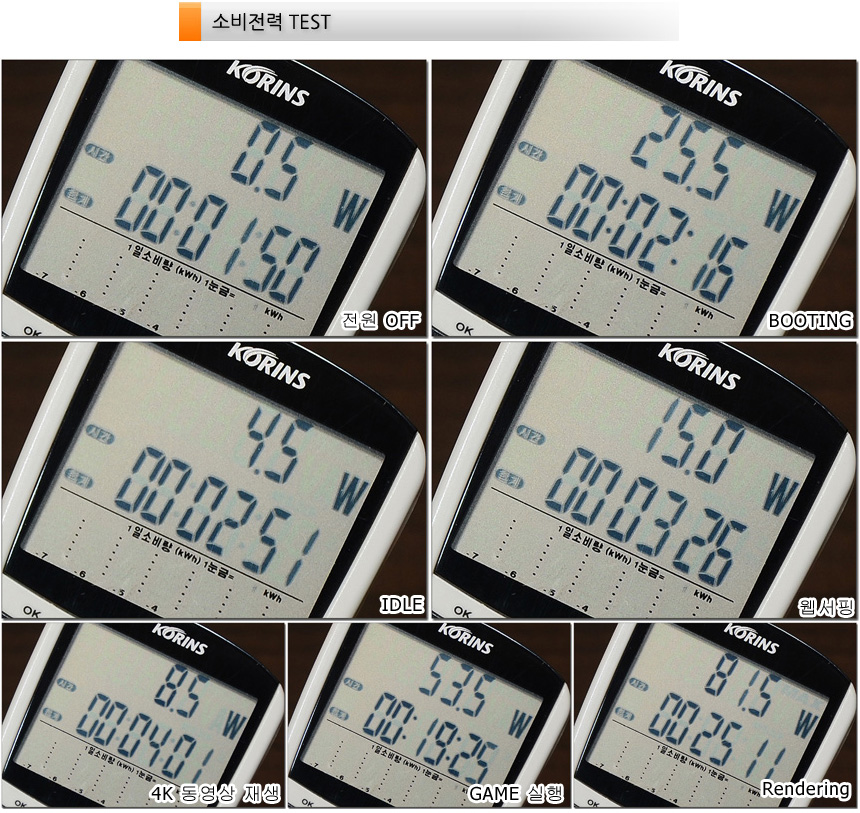 소비전력 테스트를 진행하고 있는 모습으로 (밝기 50%, 최고성능 모드) 캐주얼한 작업에서는 20W 미만의 낮은 소비전력으로 작동했으며 높은 성능을 필요로 하는 게임에서는 35~50W 대로 작동했다. 또한 블랜더 랜더링 테스트에서는 80W 까지 소비전력이 올라가는 것을 확인할 수 있었다.