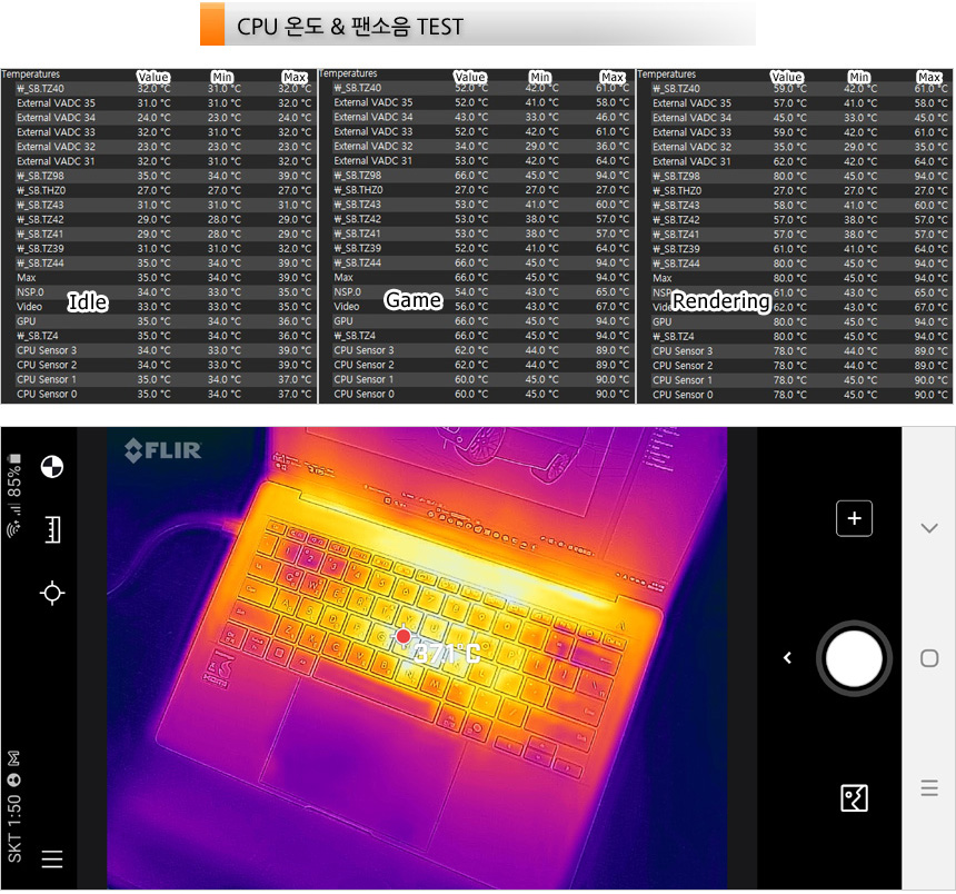 팬소음 테스트를 진행하고 있는 모습으로 (최고성능 모드) 아이들이나 문서작업 등에서는 생활소음 이외에는 노트북에서 소음이 들리지 않았으며 게임 실행시에는 듀얼팬이 빠른 속도로 작동해 팬소음이 커지는 것을 확인할 수 있었다. (팬소음을 줄이고 싶다면 MyASUS 팬모드를 조정하기 바란다.)