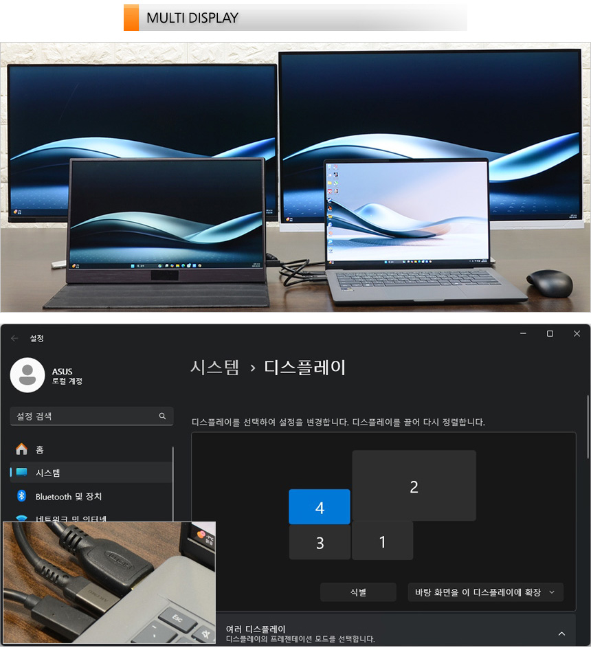 2개의 USB 4 단자가 디스플레이 출력을 지원해 HDMI를 포함한 3개의 모니터를 추가할 수 있다. 상단의 사진은 멀티 디스플레이 테스트를 진행하고 있는 모습으로 원할하게 작동하는 것을 확인할 수 있었다. 다중 모니터 사용이 필수적인 직장인 이나 대학생들이 특히 유용하게 활용할 수 있을 것이다.