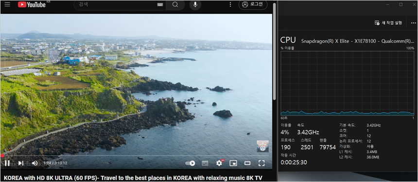 유튜브 고화질 동영상을 이용해 CPU 점유율을 테스트 하고 있는 모습으로 (2160P@60FPS) 3-7% 대의 점유율을 보여 주었으며 인터넷을 실행했을 때 30% 초반까지 점유율이 올라가는 것을 확인할 수 있었다. (CPU의 움직임이 아주 안정적이었다.)