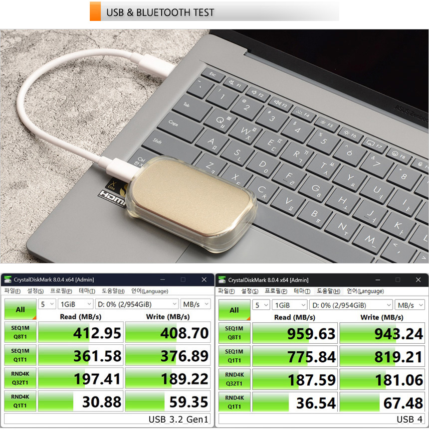 USB 4 단자를 지원해 빠른 데이터 전송이 가능하다. 상단의 사진은 외장 SSD를 이용해 테스트를 진행하고 있는 모습으로 USB 3.2 Gen1 과 확연한 차이를 보여주는 것을 확인할 수 있다.