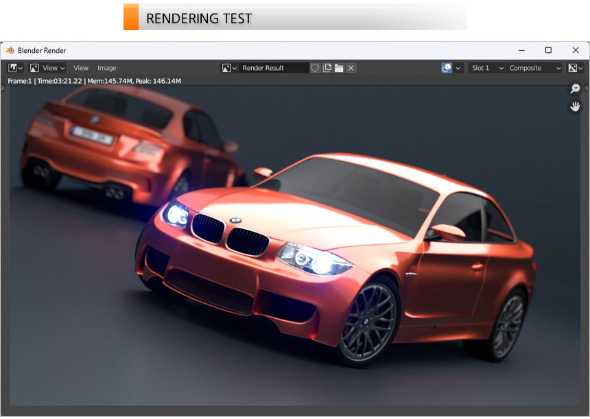 블랜더 랜더링 테스트를 진행한 모습으로 에서는 3분대의 빠른 랜더링 시간을 보여주었다. 90W 전원 어댑터를 제공하는 노트북으로 작업용으로도 충분히 사용할 수 있을 것이다.