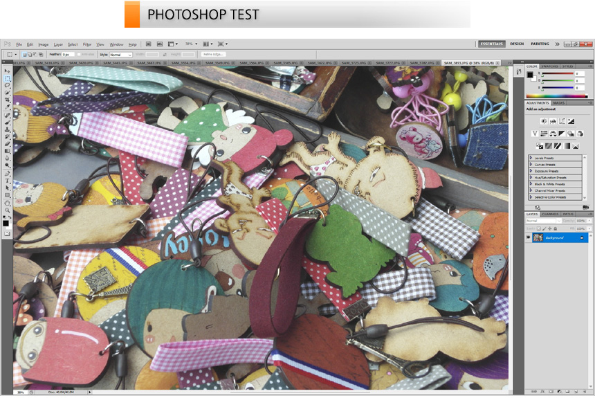 포토샵 사진편집 테스트를 진행하고 있는 모습으로 고성능 프로세서와 16GB 메모리 탑재 모델답게 부드럽게 작업할 수 있었다. OLED 디스플레이를 사용한 노트북으로 디자인 용도로 충분히 활용할 수 있을 것이다. @ 46장의 원본 사진 (총 180MB) 을 로딩하는데 걸리는 시간을 측정했는데 21 초가 소요되었다.
