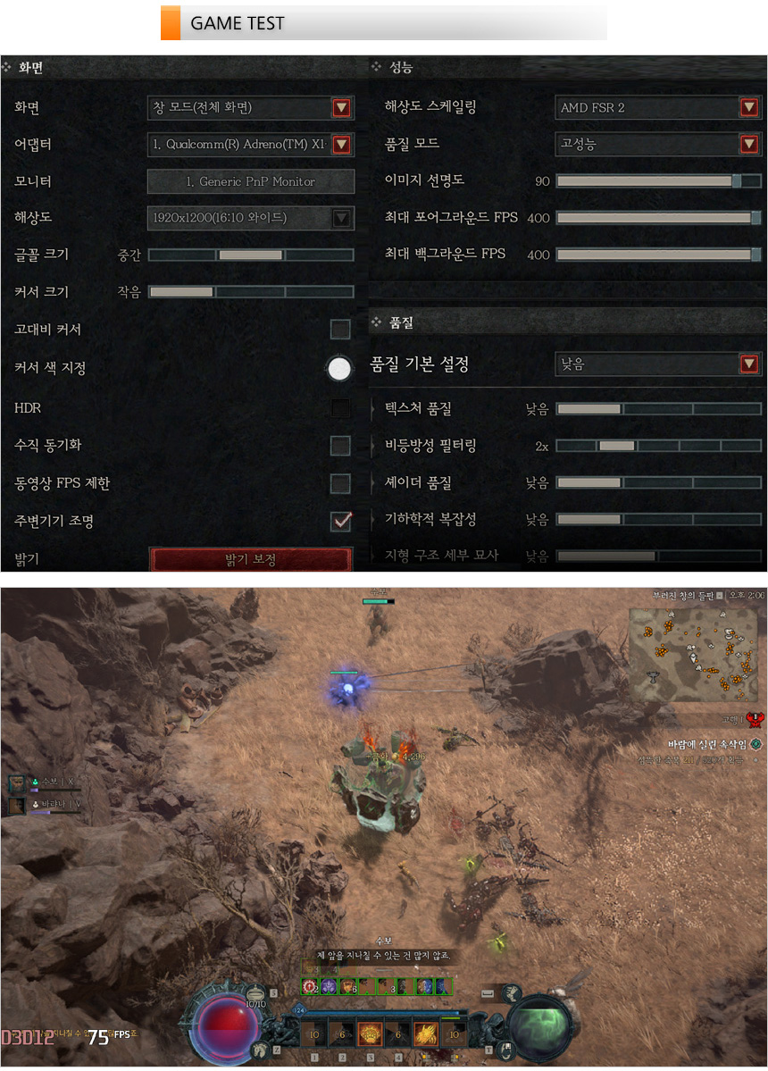 설치 게임중 디아블로 4만 정상적으로 동작해 게임 테스트를 진행할 수 있었다. 낮음 옵션에서 FSR2를 활성화 하게 테스트를 진행했는데 59-81 프레임을 보여주어 원활하게 게임을 즐길 수 있었다. (가끔씩 프레임 드랍이 발생하긴 했지만 충분히 게임을 즐길 수 있는 수준이었다.)
