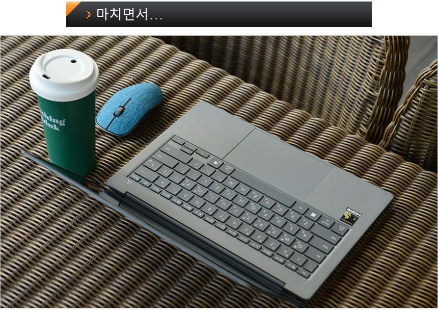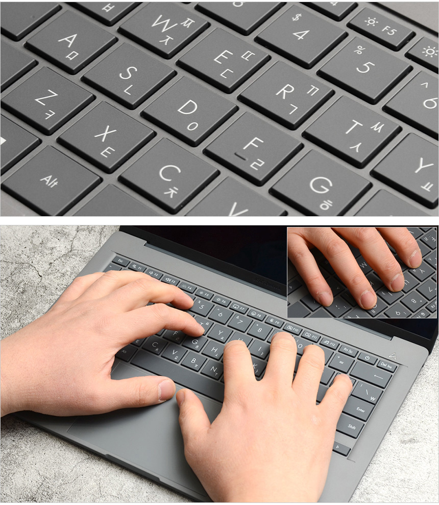 타이핑 테스트를 진행하고 있는 모습으로 낮은 키압대비 구분감이 확연해 작음 힘으로 깔끔하게 타이핑 할 수 있었으며 컴팩트 모델임에도 키의 크기가 크고 간격도 넓어 오타없는 고속 타이핑이 가능했다. (노트북 크기는 작지만 타이핑 만족감을 높일 수 있도록 디자인된 모델이다.) 또한 팜래스트가 편하게 손을 올려둘 정도로 넓어 장시간 타이핑시 피로감도 크지 않았다.