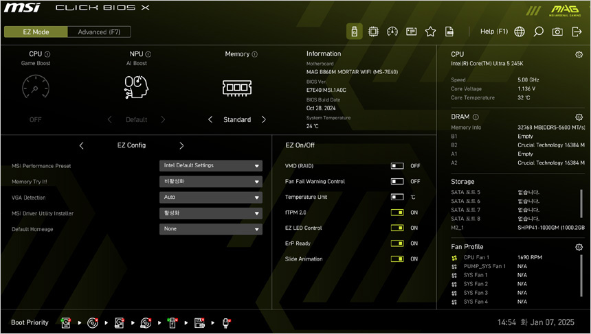 테스트를 위해 시스템을 구성한 모습으로 인텔코어 울트라 200 시리즈 프로세서와 호환되는 MSI MAG B860 박격포 WIFI 메인보드를 사용했으며 (바이오스는 최신으로 업데이트 했다.) 메모리는 XMP를 지원하는 32GB 듀얼채널 튜닝램을 장착했다. 또한 RTX 3070 Ti 그래픽카드와 최상급 SSD인 SK하이닉스 P41을 장착했다.