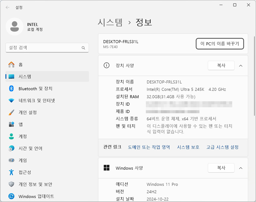 시스템 조립 후 윈도우를 설치하고 바이오스에 진입한 모습으로 CPU 가 정상적으로 인식되는 것을 확인할 수 있었다. (튜닝램을 사용해 XMP도 조정할 수 있고 AI 부스트도 활성화 할 수 있다.) 또한 윈도우 11 설치후 시스템 정보를 확인했을때 정상적으로 CPU가 인식되는 것을 확인할 수 있었다.