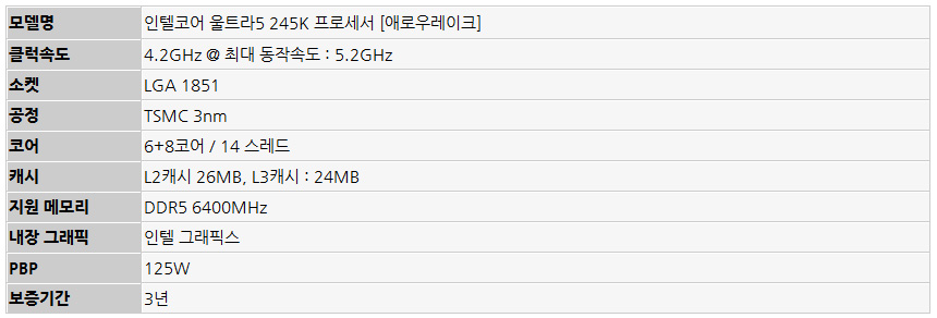 이번에 리뷰를 진행 할 인텔코어 울트라5 245K 프로세서는 게이머와 크리에이터를 위한 고성능 프로세서로 울트라 7 이나 울트라 9 대비 낮은 가격으로 부담없이 고성능 PC를 만들 수 있다. TSMC N3B (3nm) 공정을 통해 전성비를 한층 높여 전작에서 단점으로 지적되던 발열 문제를 획기적으로 개선했으며 AI 딥러닝 가속화를 위한 NPU를 탑재해 다양한 AI 기술을 활용할 수 있다.