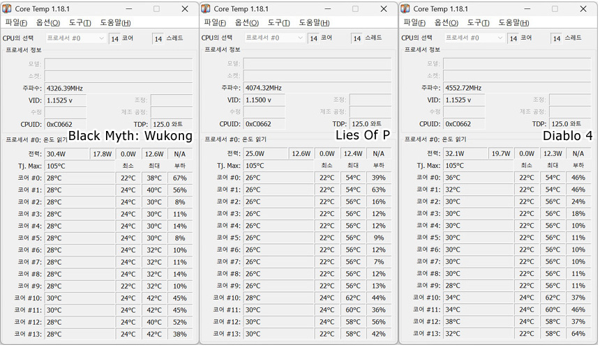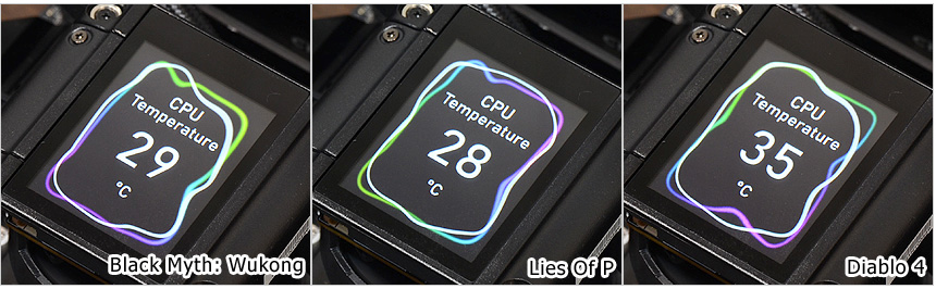게임 실행시의 소비전력과 온도를 테스트 해 보았다. 3가지 게임을 테스트 했을 때 소비전력이 상당히 낮은 것을 확인할 수 있었으며 CPU의 온도도 14세대 이전의 프로세서와는 확연히 다른 것을 확인할 수 있었다. (실내 온도는 14도였다.) 4K 해상도 에서의 테스트 이며 해상도를 낮추었을 때 소비전력이 다소 올라가긴 했지만 큰 차이는 아니었다. 테스트에 사용된 코어리퀴드 S360 과 같은 최상급 수랭쿨러는 사용할 필요가 없어 보이며 공랭이나 보급형 수랭쿨러러도 충분히 열을 식혀줄 수 있다.