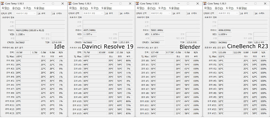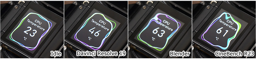 아이들 상태에서의 전력소비가 상당히 적은 것을 확인할 수 있었으며 영상편집 프로그램인 다빈치 리졸브를 이용해 랜더링 테스트를 진행했을 때 100W 에 못미치는 소비전력으로 작동했으며 온도도 상당히 낮았다. CPU 의존율의 높은 블랜더와 시네벤치 실행시에도 65도를 넘지 않는 것이 대단히 인상적이었다.