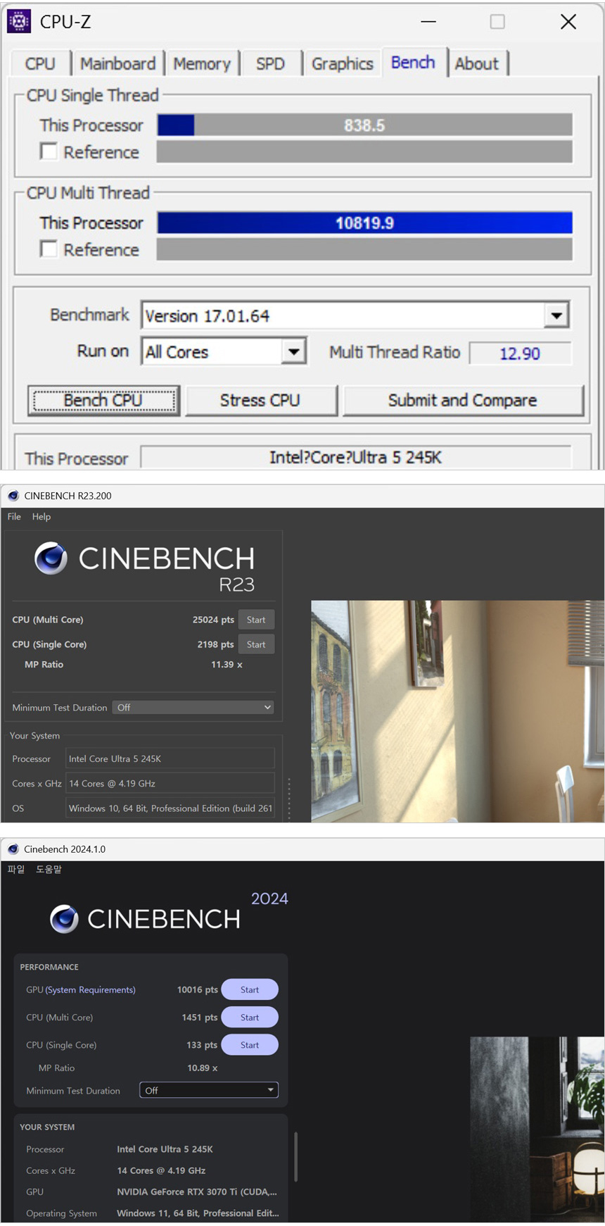 CPU 성능 확인용으로 많이 사용되는 CPU-Z와 시네벤치를 이용해 테스트를 진행한 모습으로 최신 게임을 즐기기에 부족함 없는 높은 스코어를 보여주는 것을 확인할 수 있었다. 게임은 물론 작업용으로도 유용하게 활용할 수 있을 것이다. (전작인 14600K 대비 멀티와 싱글코어 스코어 모두 살짝 높아졌다.)
