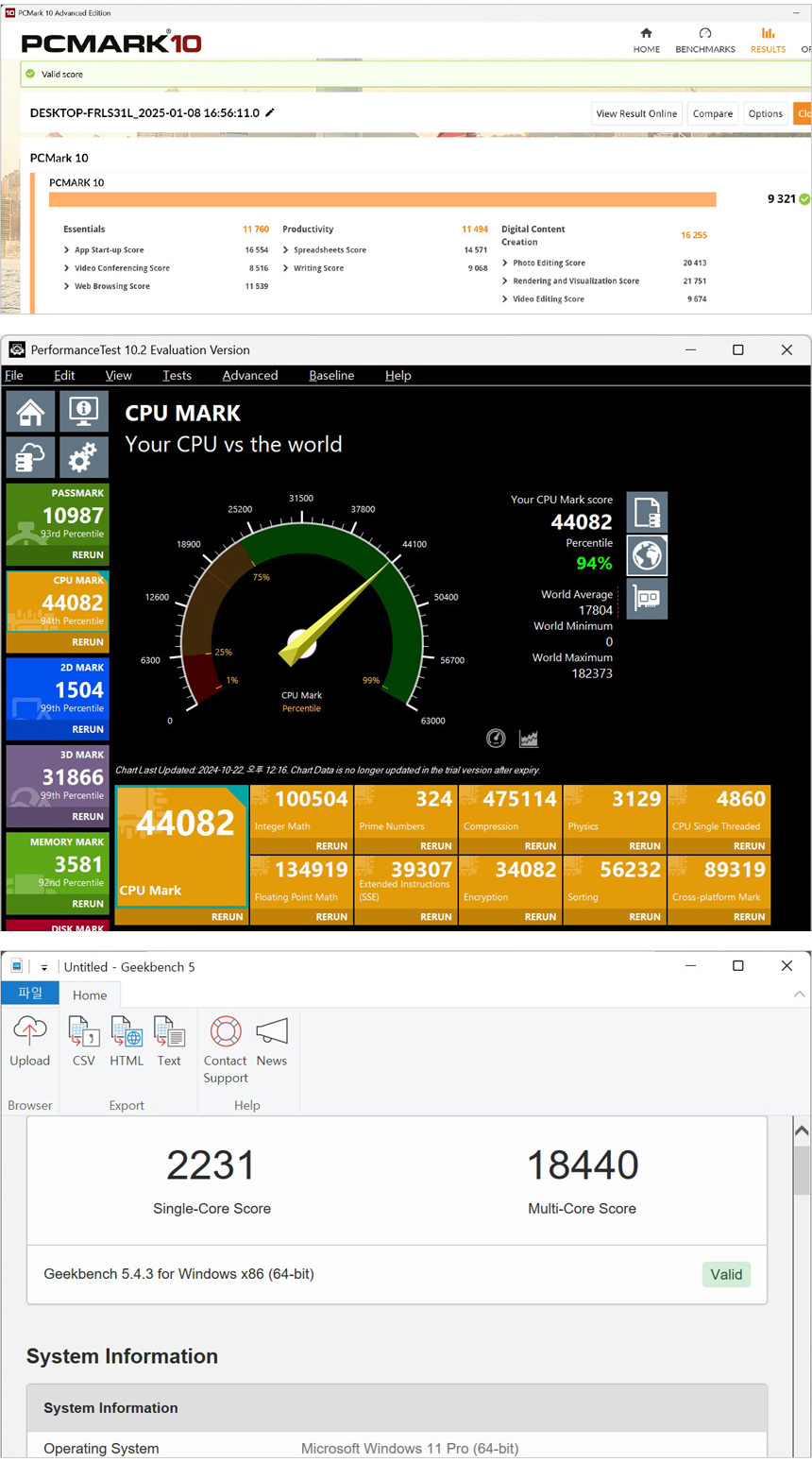 시스템의 전반적인 성능을 확인할 수 있는 PCMARK10와 퍼포먼스 테스트, 긱벤치 5를 실행한 모습으로 상단에 언급했던 테스트와 같이 스코어가 높아진 것을 확인할 수 있었다. (참고로 14600K 의 긱벤치 싱글은 2060, 멀티는 16632 이다.)