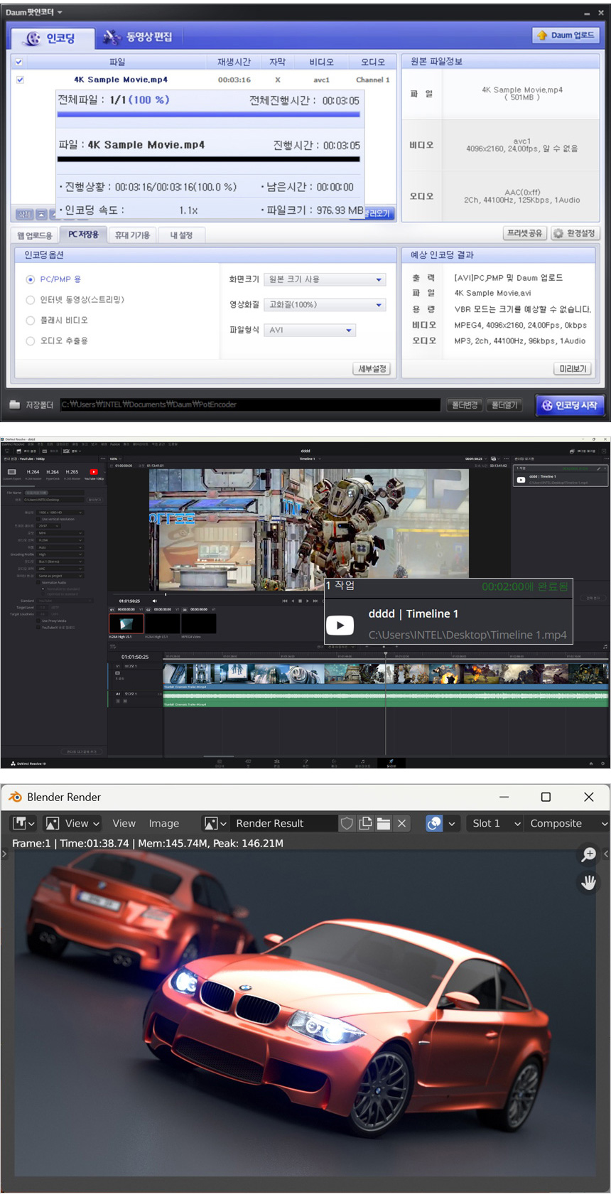 동영상 인코딩과 4K 랜더링 테스트를 진행하고 있는 모습으로 인코딩 시간은 3분 5초가 소요 되었고 (14600K 는 3분 7초) 랜더링 시간은 (다빈치 리졸브를 사용했으며 640MB, 920MB, 990MB 4K 동영상을 단일 동영상으로 랜더링, FHD 해상도에 H.264 비디오 코덱) 2분 00초가 소요되었다. (14600K는 2분 51초) 또한 블랜더 랜더링 테스트에서는 1분 38초가 소요되는 것을 확인할 수 있었다. (14600K에서는 1분 43초)