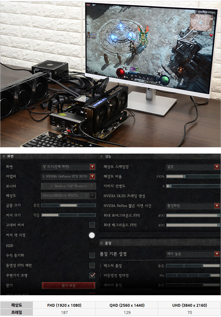 디아블로 4를 이용해 프레임 테스트를 진행한 모습으로 (키오바샤드에서 측정) 프레임이 상당히 높은 것을 확인할 수 있었다. 해상도나 옵션에 관계없이 부드럽게 게임을 즐길 수 있다. @ 맵이나 낮/밤 유무에 따라 프레임이 달라진다. 이점 참조 바란다.