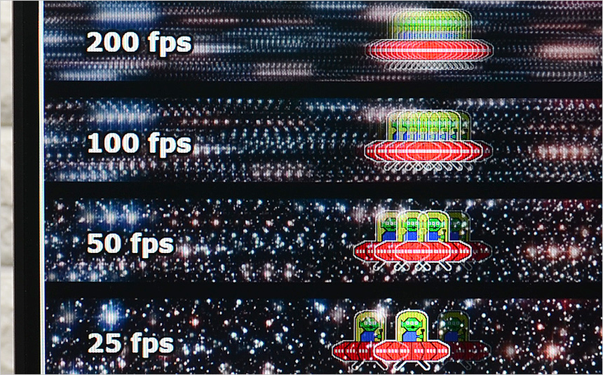 상단의 사진은 200Hz 의 높은 주사율을 쉽게 확인할 수 있도록 하위 프레임과 같이 재생되는 영상 (960 Pixel Per Sec) 을 셔터스피드 1/20 로 촬영한 모습으로 프레임이 높아질수록 시간당 많은 화면이 뿌려지기 때문에 캐릭터의 수가 많은 것을 확인할 수 있다. 직접 눈으로 영상을 볼 경우 200Hz 의 경우 무척 자연스럽게 UFO 가 이동한다.