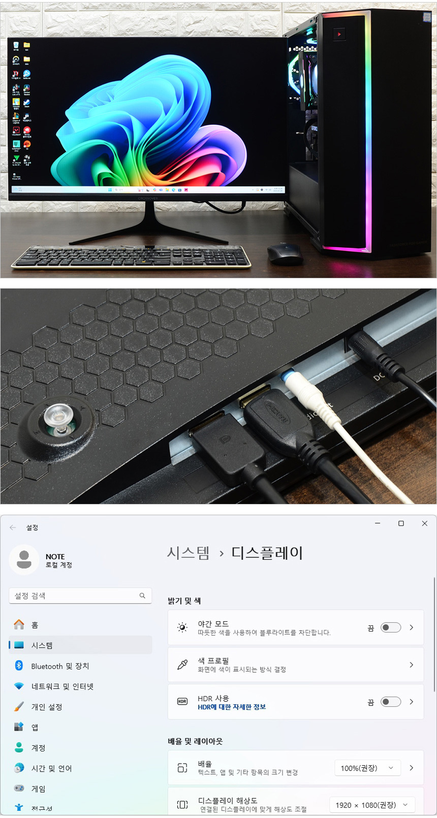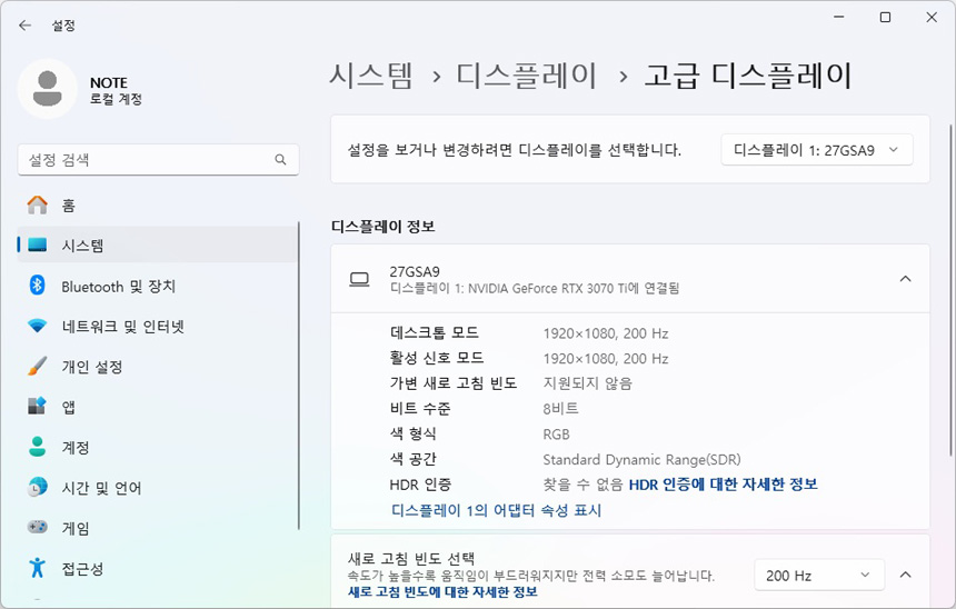 테스트를 위해 모니터를 책상에 설치한 모습으로 27형 슬림 모니터 답게 많은 공간을 차지하지 않았다. HDR 기술을 지원하는 모델답게 HDR 설정이 가능한 것을 확인할 수 있으며 DP와 HDMI를 지원해 다양한 디바이스를 연결할 수 있다. (HDMI 는 144Hz 까지 지원한다. PC와 연결해 게임을 즐긴다면 DP 단자를 활용하기 바란다.)