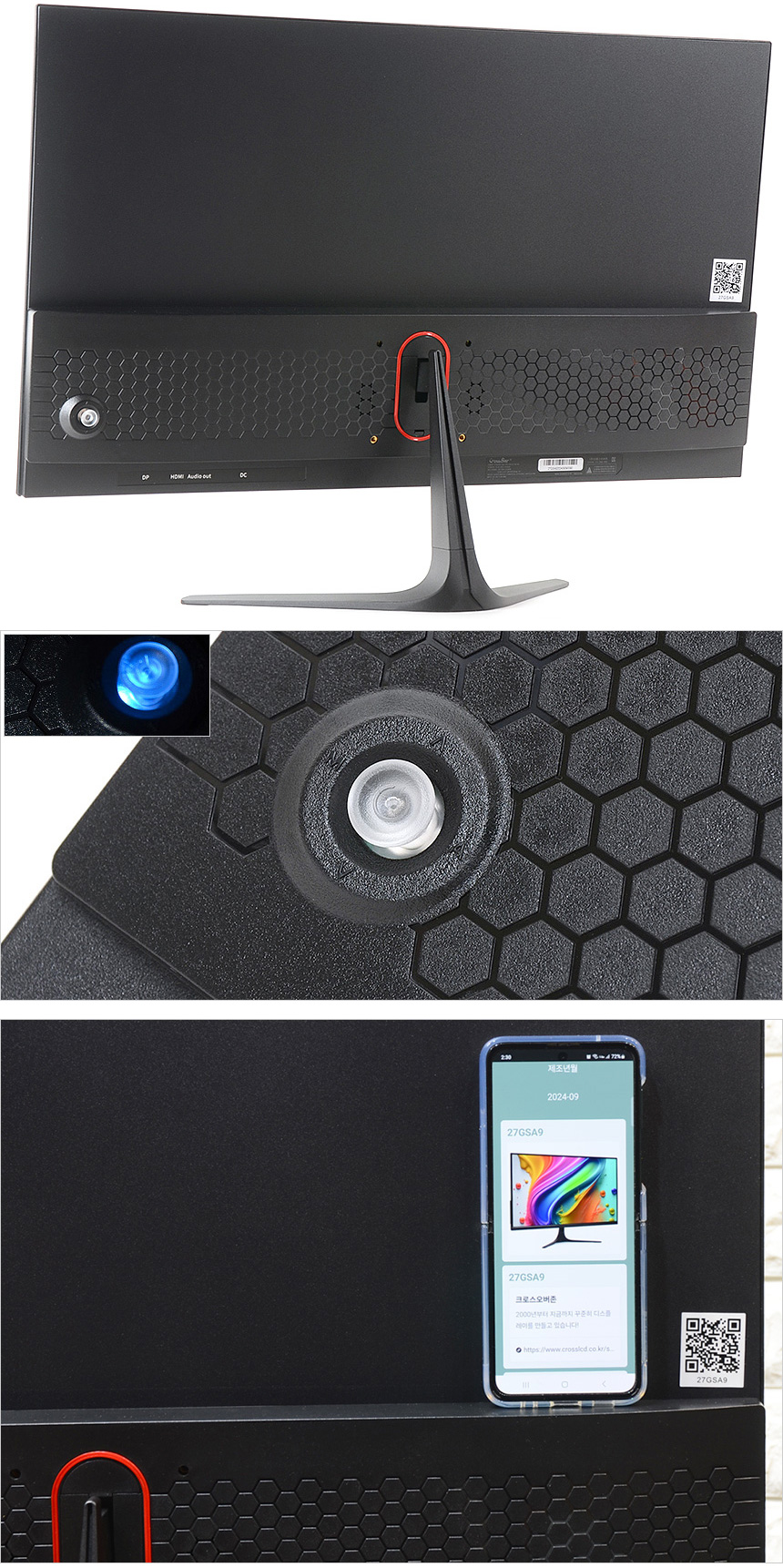 모니터 후면부의 모습으로 측면에는 조그 버튼이 설치되어 손쉽게 메뉴를 조정할 수 있으며 (버튼을 눌러 ON/OFF 할 수 있으며 LED가 내장되어 모니터 상태를 쉽게 확인할 수 있다.) 측면에 부착된 QR코드 스티커를 스마트폰으로 스캔하면 제조일과 제품 정보등을 확인할 수 있다.