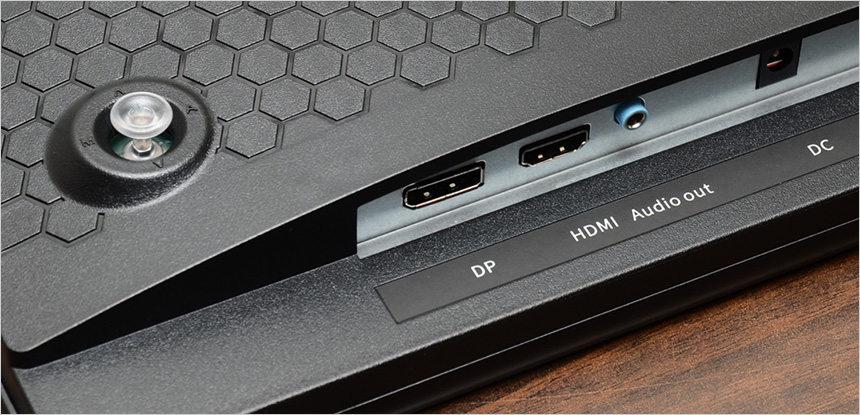 75mm 베사홀이 설치되어 벽에 걸거나 ARM 등에 장착해 사용할 수 있으며 (스탠드는 손쉽게 탈부착 할 수 있다.) 하단에는 DP 단자와 HDMI 단자, 전원 & 오디오 Out 단자가 설치된 것을 확인할 수 있다. 또한 2개의 3W 스피커가 장착되어 시원한 사운드를 즐길 수 있다.
