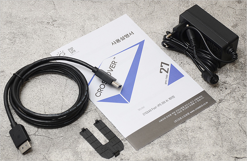 기본 제공되는 액세서리의 모습으로 사용 설명서를 비롯해 케이블 일체형 전원 어댑터와 DP 케이블, 후면커버가 제공되는 것을 확인할 수 있다.