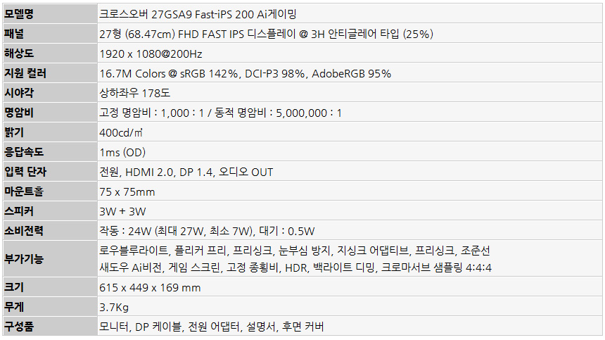 화질 좋은 200Hz 가성비 게이밍 모니터, 크로스오버 27GSA9 Fast-iPS 200 Ai게이밍