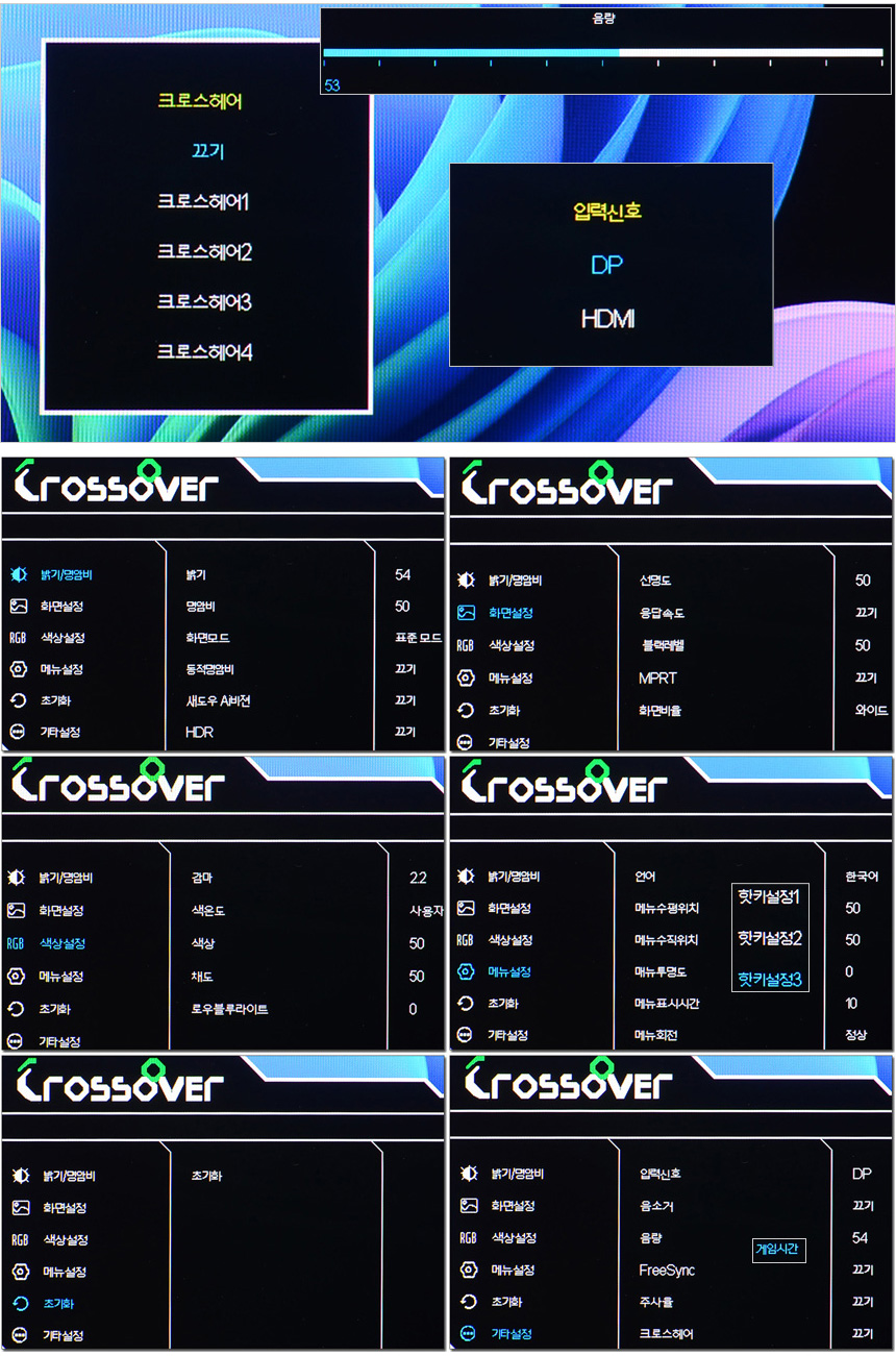 OSD의 모습으로 조그다이얼에서 핫키를 지원해 볼륨, 입력소스, 조준선 등을 빠르게 선택할 수 있으며 메인메뉴를 통해 밝기와 명암 설정을 비롯해 화면모드 및 동적 명암비 설정이 가능하다. 또한 화면비율?설정이 가능하며 색온도와 OSD 설정, 초기화, 로우블루라이드 설정과 블랙레벨, 프리싱크 설정을 지원한다. (어두운 화면을 세밀하게 표현하고 잔상을 줄여주는 새도우 Ai비전 기능이 추가된 것도 눈에 띈다.)