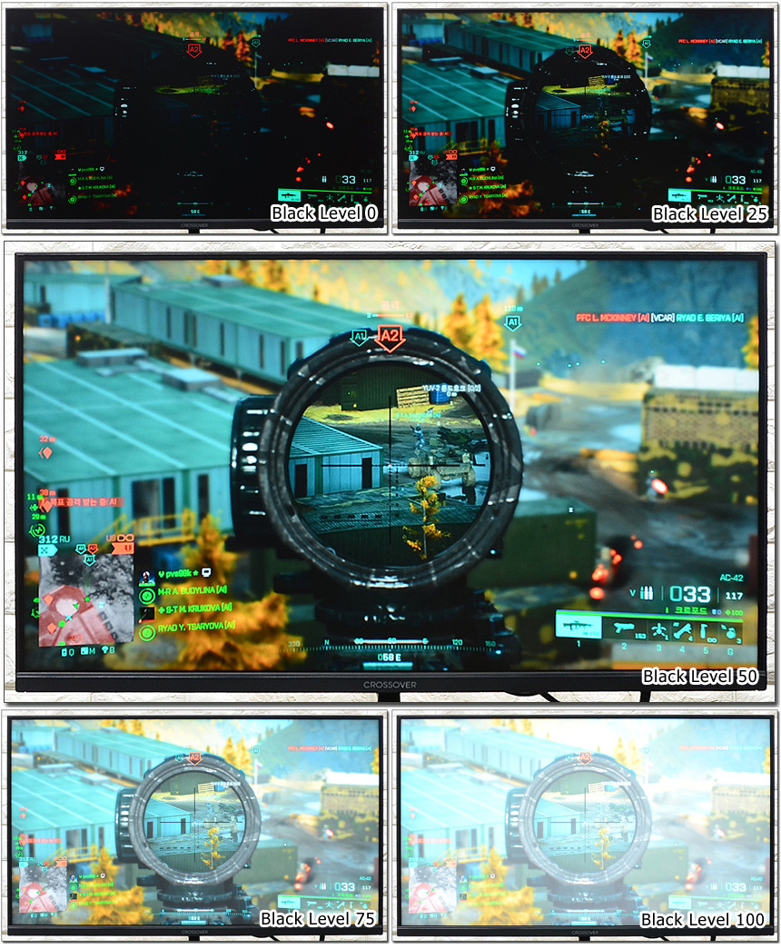 적절한 블랙레벌 조정을 통해 게임에서 시인성을 높일 수 있다. 밝아지는 만큼 색감이 떨어지기 때문에 선명도와 시인성을 전반적으로 고려해 설정하기 바란다. (50-70 사이의 설정을 추천한다.)