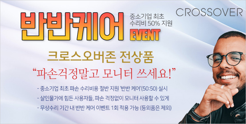 크로스오버 전상품은 5억원 생산물 배상 책임보험에 가입되어 있으며 중소기업 최초로 수리비 50%를 지원하는 반반케어 이벤트를 진행하고 있어 안심하고 사용할 수 있다. (무상수리 기간내 파손이 발생했을 때 수리비용의 절반을 지원한다.)