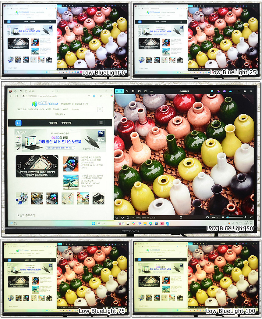 눈건강을 해치는 블루라이트 감소 기능을 제공한다. 상단의 사진은 단계별 영상의 모습으로 설정값에 따라 차이가 발생하는 것을 확인할 수 있다.