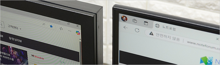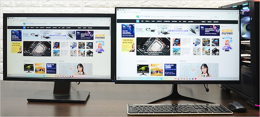 2대의 모니터를 설치한 김에 베젤 두께를 확인하고 있는 모습으로 확연한 차이를 보여주었다. 슬림 베젤이 적용된 모델로 높은 몰입감을 경험할 수 있을 것이다.