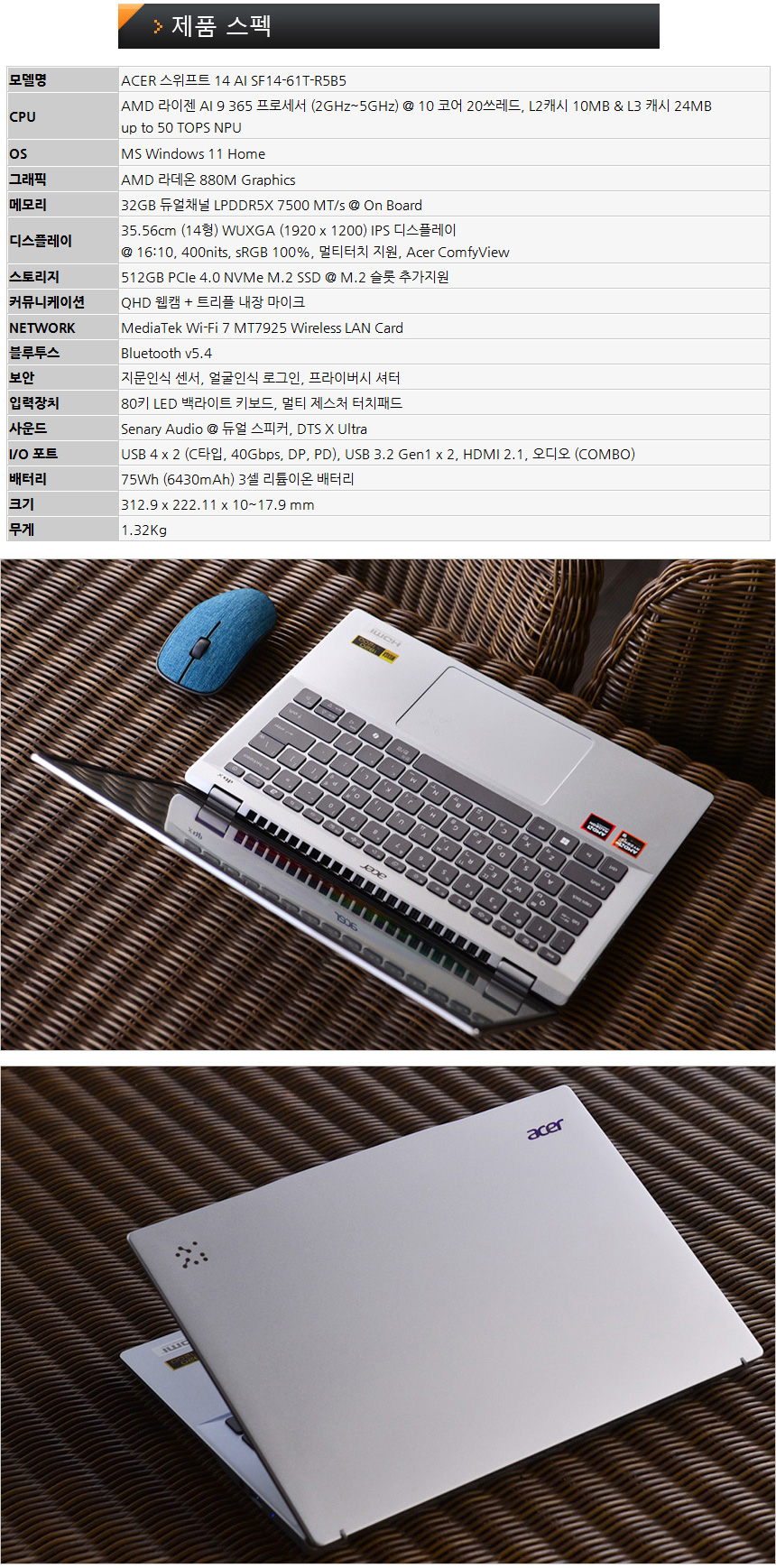 휴대성과 성능 모두 잡은 프리미엄 슬림 노트북, ACER 스위프트 14 AI SF14-61T-R5B5