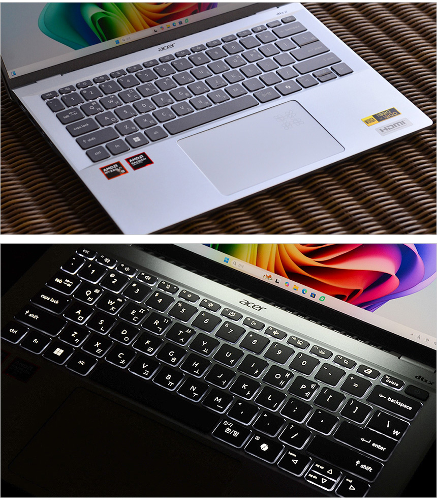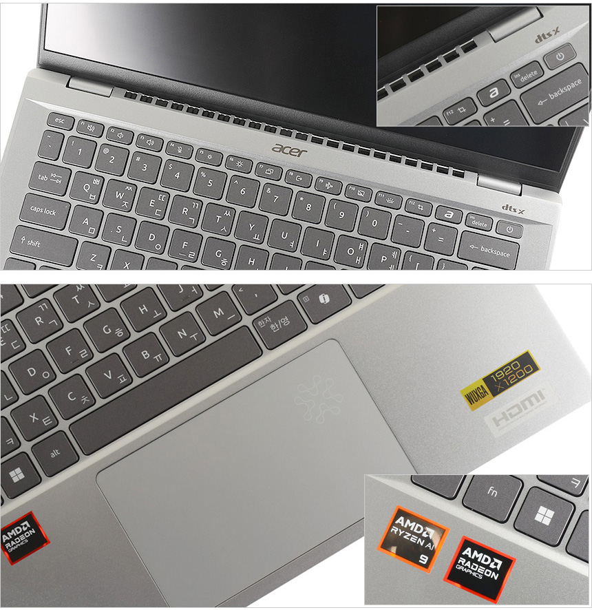 전원 버튼에 지문인식 센서가 장착되어 보안성과 편의성을 높일 수 있으며 키보드 1열에는 다양한 펑션키가 제공되어 편하게 노트북을 사용할 수 있다. 뿐만 아니라 AcerSense 앱을 실행할 수 있는 전용키와 코파일럿 전용키가 제공되어 빠르게 실행할 수 있으며 팜래스트에는 전작대비 44% 커진 멀티패드가 부착되어 마우스를 사용하기 힘든 외부에서도 편하게 노트북을 조작할 수 있다. (코파일럿을 실행시 터치패드에 있는 액티비티 인디케이터에 차례대로 불이 들어온다.)