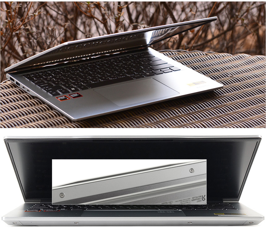 노트북 전면부의 모습으로 손쉽게 상판을 들어올릴수 있도록 원핸드 오픈방식이 적용된 것을 확인할 수 있다. (무게중심을 고려한 설계로 상판을 들어 올렸을 때 하판이 따라 올라오지 않는다.) 또한 힌지의 압력도 높아 어떤 각도에서도 상판의 움직임이 없었다. (동영상을 참조하기 바란다.)