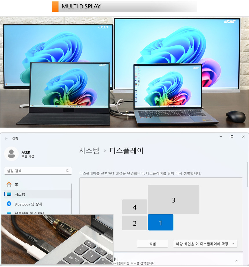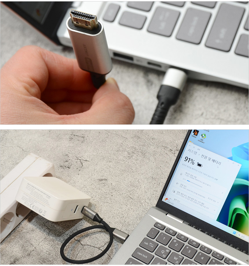 2개의 USB 4 단자가 디스플레이 출력을 지원해 HDMI를 포함한 3개의 모니터를 추가할 수 있다. 상단의 사진은 멀티 디스플레이 테스트를 진행하고 있는 모습으로 원할하게 작동하는 것을 확인할 수 있었다. 다중 모니터 사용이 필수적인 직장인 이나 대학생들이 특히 유용하게 활용할 수 있을 것이다. (2개의 모니터 추가가 가능한 인텔 루나레이크 노트북과 달리 AMD 스트릭스 포인트는 3개의 모니터 추가가 가능해 총 4개의 디스플레이를 활용할 수 있다.)