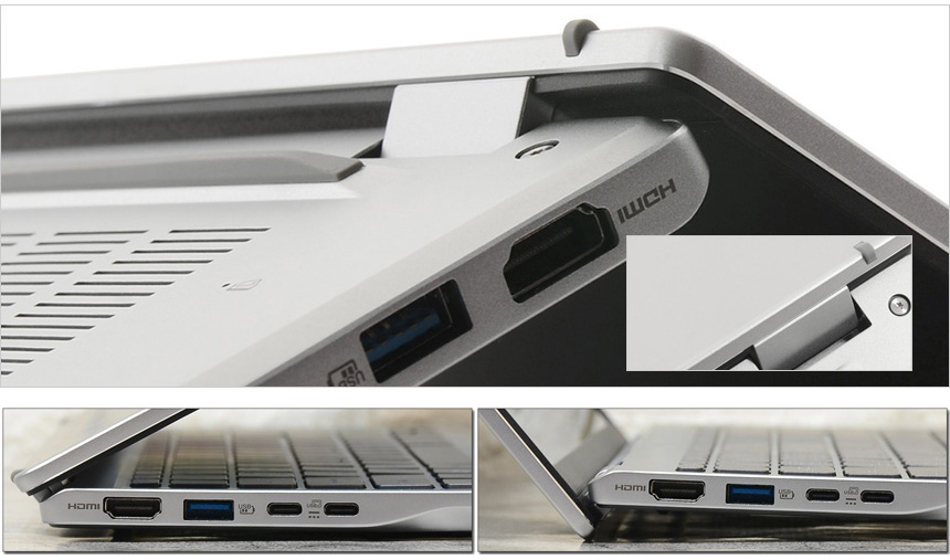 리프트 힌지를 적용해 상판을 들어 올리면 바닥과 노트북 사이에 공간이 생긴다. 차가운 공기가 원할하게 내부로 유입되며 키보드에 각도를 주어 안정적인 타이핑이 가능하고 스피커의 부밍 현상을 줄여 더 깔끔한 사운드를 즐길 수 있다.