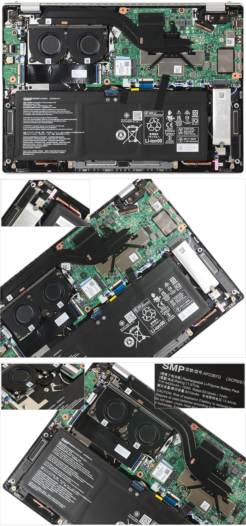 바닥면 내부의 모습으로 싱글팬이 설치된 내장그래픽 기반의 보급형 노트북과 달리 듀얼팬이 설치된 것을 확인할 수 있다. 하단에는 6430mAh 용량의 리튬이온 배터리가 장착되어 있고 모서리 부분에는 스피커와 마그네틱, 무선랜 안테나가 장착된 것을 알 수 있다.