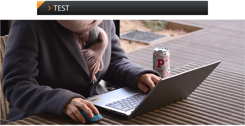 타이핑 테스트를 진행하고 있는 모습으로 휴대성에 특화된 모델이지만 키간격이 넓어 고속 타이핑이 원활했으며 부드러운 키감과 확연한 구분감을 제공해 눈으로 확인하지 않고 (손가락의 느낌 만으로) 정확하게 타이핑 할 수 있었다. 팜래스트의 면적도 좁지 않아 손을 올려두는데 무리가 없었으며 게임을 포함한 대부분의 작업에서 불쾌감을 주는 열이 전달되지 않아 쾌적하게 키보드를 사용할 수 있었다.