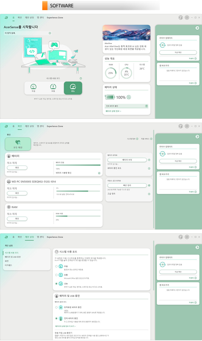 전용 S/W AcerSence를 실행한 모습으로 (키보드 부분에서 언급한 것과 같이 전용키 지원으로 빠르게 실행할 수 있다.) 시스템 모니터링과 퍼포먼스 설정이 가능하며 시스템 검사 및 기능 설정 메뉴가 제공되는 것을 확인할 수 있다. 또한 업데이트를 지원해 최상의 컨디션으로 노트북을 사용할 수 있다. (자세한 설정메뉴는 동영상을 참조하기 바란다.)