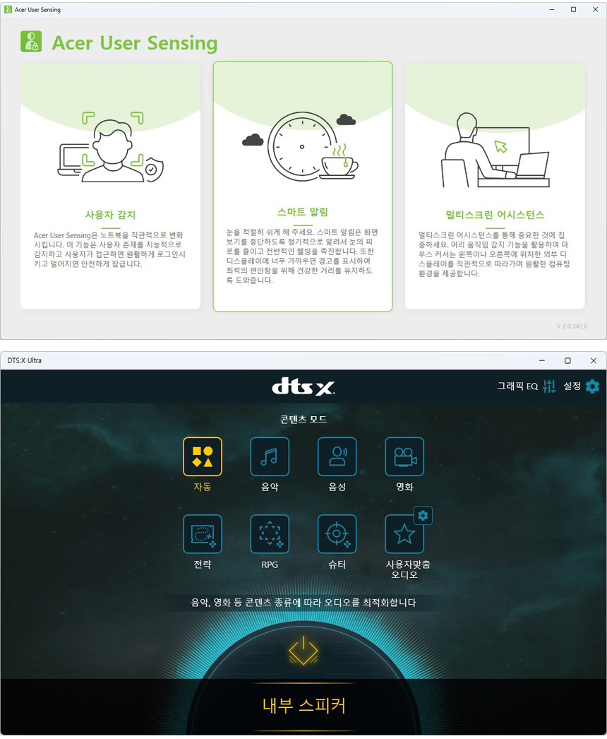 보안성과 편의성을 높일 수 있도록 에이서 유저 센싱 프로그램을 지원하고 다양한 프로파일과 EQ 설정을 지원하는 DTS:X 울트라 S/W를 제공해 컨텐츠에 최적화된 음색 설정이 가능하다.
