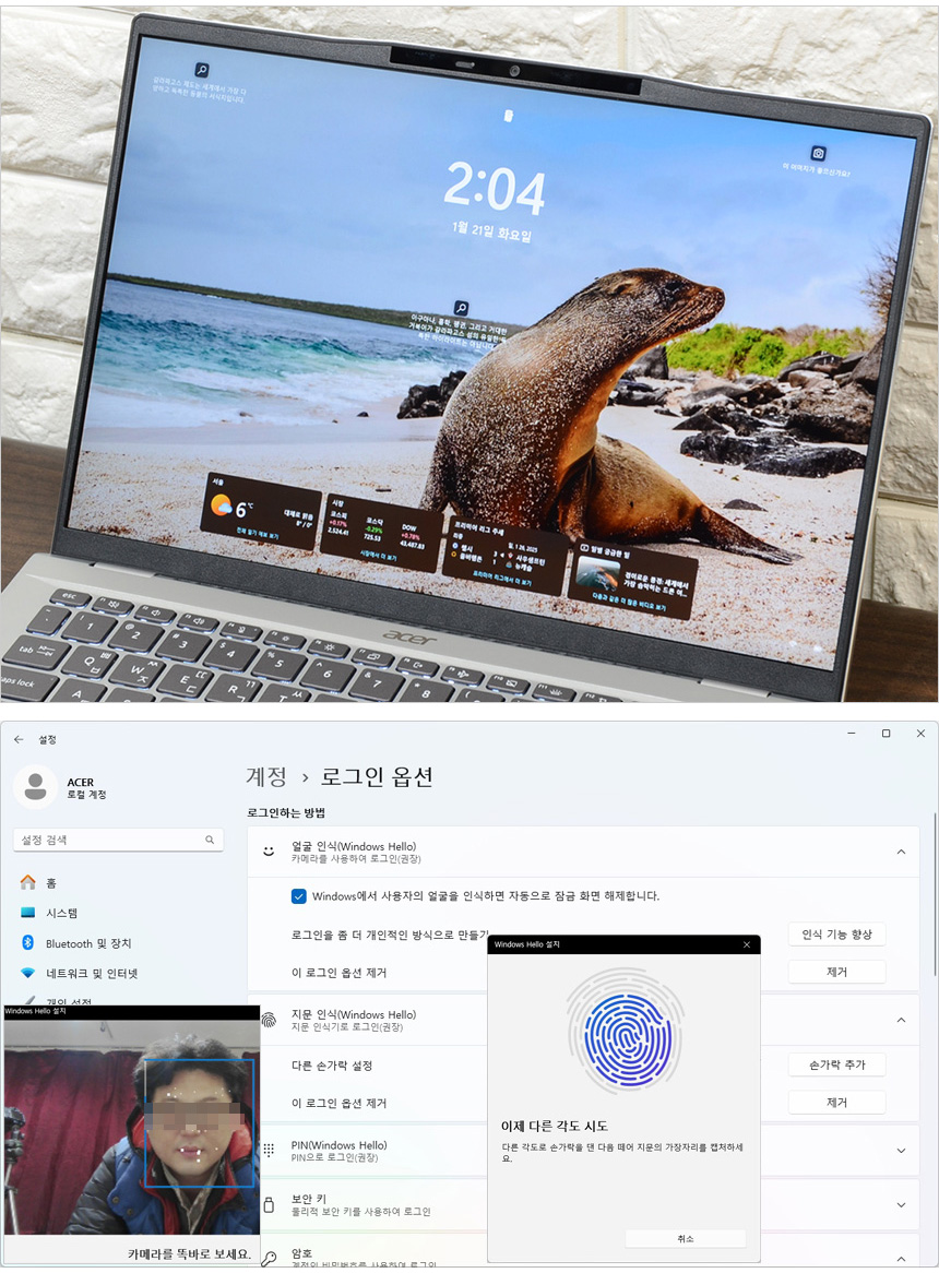 지문과 얼굴인식 로그인을 모두 지원한다. 설정-계정에 있는 로그온 옵션에서 윈도우즈 헬로를 실행해 얼굴을 등록할 수 있으며 인식율도 뛰어나 편하게 사용할 수 있다. (높은 보안을 요구하는 비즈니스 노트북으로도 적합한 모델이다.)