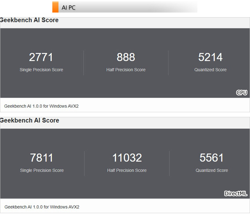 AI 전용 벤치마크 툴을 이용해 AI 성능 테스트를 진행하고 있는 모습으로 AI 에 특화된 CPU가 탑재된 모델답게 높은 스코어를 보여주었다. 50 TOPS NPU를 지원하는 모델로 그동한 테스트 했던 내장그래픽 기반 슬림 노트북중 가장 높은 스코어를 보여주었다.