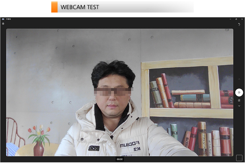 QHD 웹캠의 화질을 확인하고 있는 모습으로 어두운 실내였음에도 깔끔한 영상을 보여주었다. HD 웹캠을 압도하는 뛰어난 디테일과 선명도로 화상회의나 셀프촬영, 게임방송 등의 용도로 유용하게 활용할 수 있을 것이다.