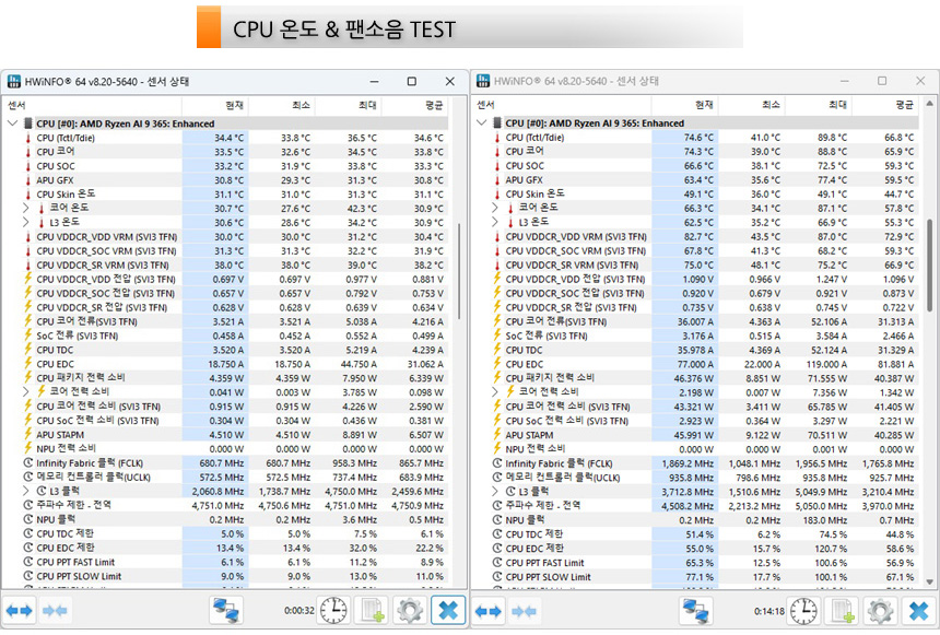 CPU 온도 테스트를 진행하고 있는 모습으로 (최고 성능 모드, 실내온도 13도) 아무것도 하지 않은 Idle 상태에서는 30도 초중반대로 동작했으며 10분간 게임을 실행하고 측정했을 때 70도 중반까지 온도가 올라가는 것을 확인할 수 있었다. (가끔씩 80도 이상으로 올라가긴 했지만 대부분 70도 내외에서 작동했다.)