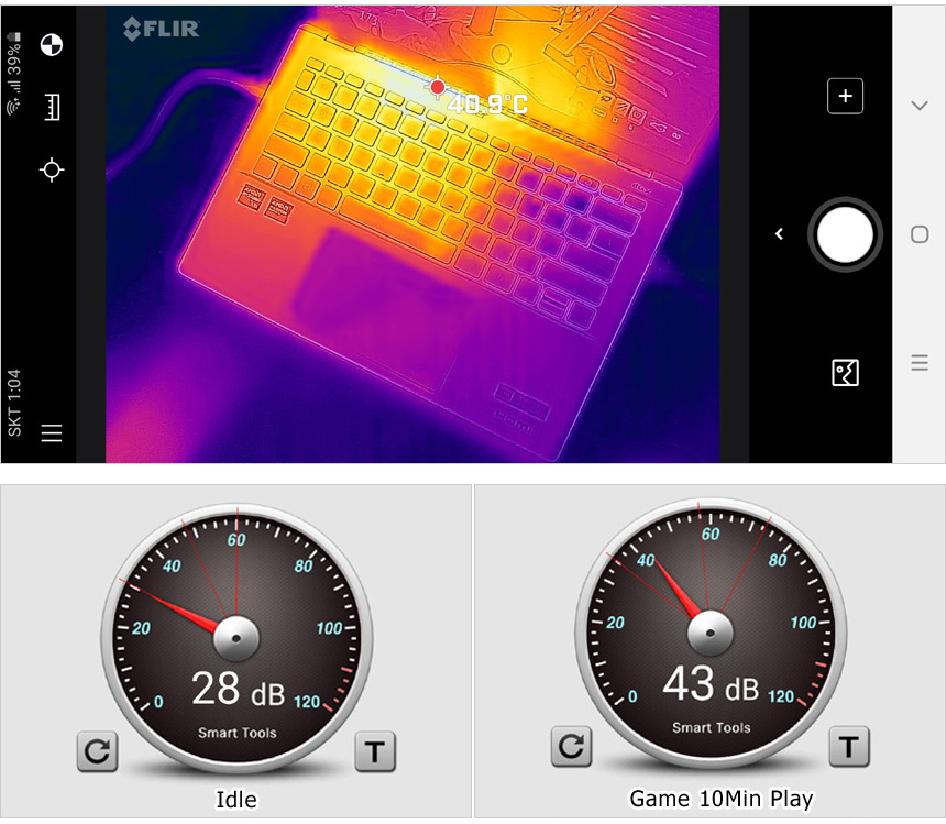 열화상 카메라를 이용해 게임 실행중 열분포를 확인하고 있는 모습으로 상단 좌측면을 중심으로 열이 퍼져나가며 팬이 설치된 우측면은 상대적으로 온도가 낮은 것을 확인할 수 있다. 또한 팜래스트 온도가 낮아 편하게 손을 올려두고 타이핑 할 수 있다. 팬소음 테스트도 실행했는데 (최고 성능 모드) 캐주얼한 작업시에는 팬소음이 주변 생활소음에 묻혀 들리지 않았으며 게임이나 영상편집 S/W 등을 실행했을 때에는 43dB 까지 팬소음이 높아지는 것을 확인할 수 있었다. @ 최대성능 모드로 테스트를 진행했다. 팬소음이 부담스럽다면 에이서 센스에서 퍼포먼스를 조정하기 바란다. 차고 넘치는 성능을 가진 노트북으로 옵션을 조정해도 사용하는데 불편은 없을 것이다.