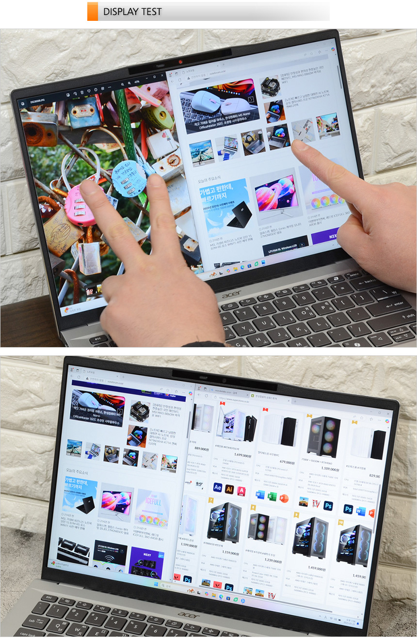 디스플레이의 모습으로 OLED를 사용했던 전작과 달리 IPS 패널이 탑재된 것을 확인할 수 있었다. 시야각으로 인한 불편없이 어떤 각도에서도 선명한 영상을 즐길 수 있으며 400nits의 높은 밝기 지원으로 밝은 야외에서도 높은 시인성을 구현한다. 특히 터치를 지원하는 대부분의 노트북이 글레어 타입을 적용해 반사가 발생하는데 반해 이 제품은 논글레이 타입을 적용해 반사로 인한 스트레스 없이 사용할 수 있다.