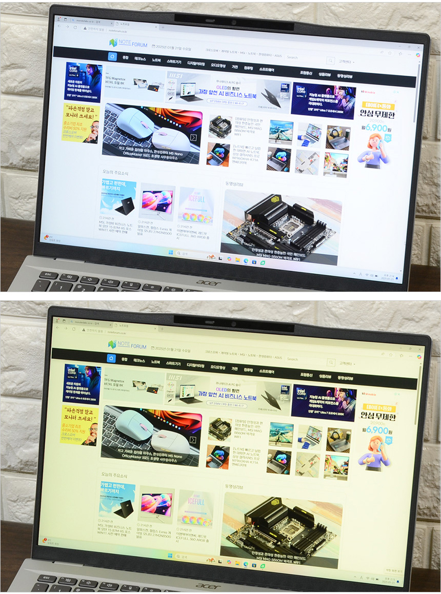 IPS 패널을 탑재해 어떤 각도에서도 선명한 영상을 즐길 수 있다. 상단의 사진은 시야각 테스트를 진행한 모습으로 극단적인 각도에서도 반전이나 채도저하가 발생하지 않았다.