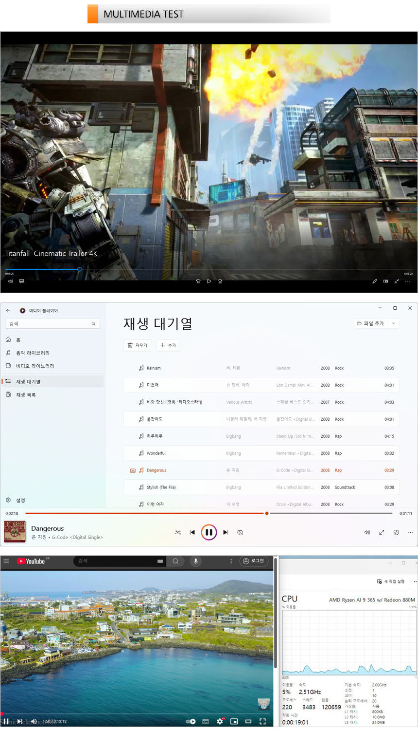 MP3 파일을 이용해 사운드 테스트를 진행하고 있는 모습으로 출력이 상당히 높아 사무실 정도는 가득 채우는 시원한 소리를 들려 주었으며 바닥면이 살짝 들리는 드롭 힌지가 적용된 노트북 답게 부밍등의 현상없이 깔끔한 사운드를 들려 주었다. 유튜브 고화질 동영상을 이용해 CPU 점유율을 테스트 하고 있는 모습으로 (2160P@60FPS) 5-12% 대의 점유율을 보여 주었으며 인터넷을 실행했을 때 30% 초반까지 점유율이 올라가는 것을 확인할 수 있었다. (CPU의 움직임이 아주 안정적이었다.)