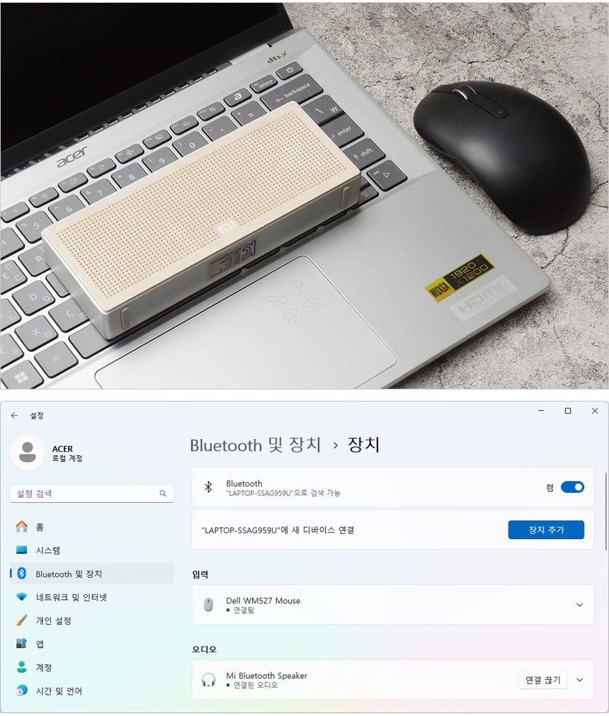 블루투스를 지원해 다양한 액세서리를 무선으로 연결할 수 있다. 상단의 사진은 스피커와 마우스의 연결 모습으로 원활하게 페어링 되는 것을 확인할 수 있었으며 완벽하게 작동했다.