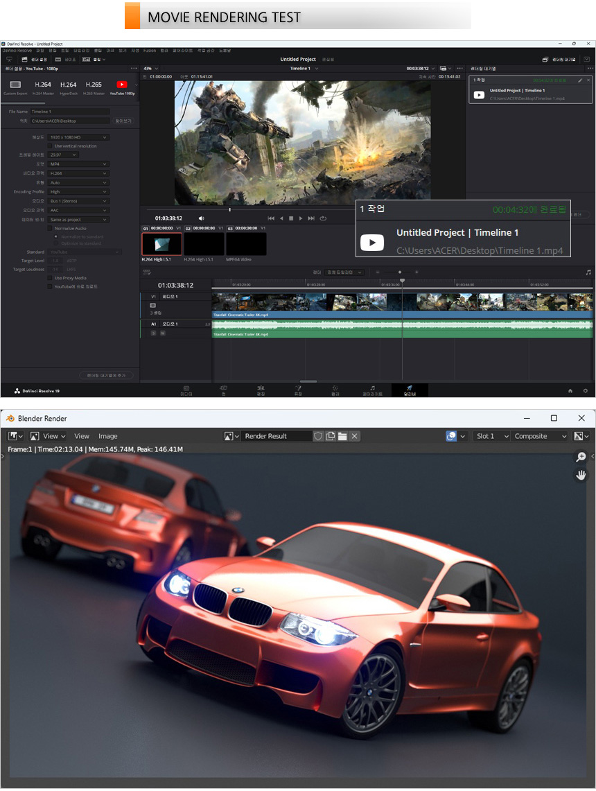 영상편집 S/W 다빈치 리졸브를 이용해 랜더링 테스트를 진행하고 있는 모습으로 (640MB, 920MB, 990MB 4K 동영상을 단일 동영상으로 랜더링, FHD 해상도에 H.264 비디오 코덱) 4분 32초가 소요되는 것을 확인할 수 있었다. 또한 블랜더 랜더링 테스트 에서는 2분 13초가 소요되었다. @ 경쟁 모델을 압도하는 빠른 랜더링 시간을 보여준 모델이다. 영상편집 등의 용도로 유용하게 사용할 수 있을 것이다.